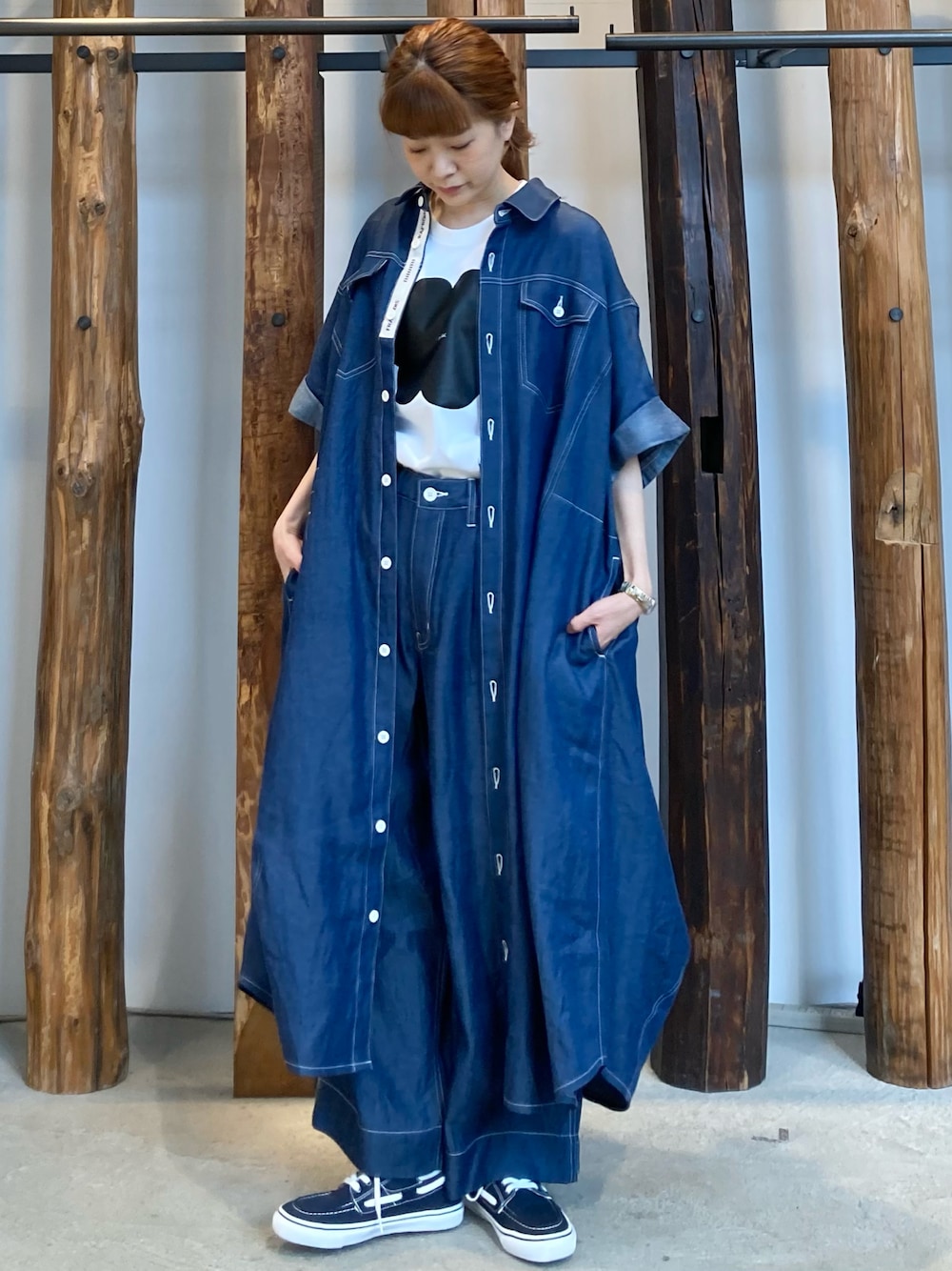昨日ご紹介したデニムワンピースを羽織で着てみました。 ボトムも同じ素材のパンツを合わせて、セットアップとして着用しています。 インナーは胸元のフキダシのプリントが印象的なTシャツを合わせて、カジュアルなイメージで。 キメ過ぎない大人カジュアルなコーディネートになりました。