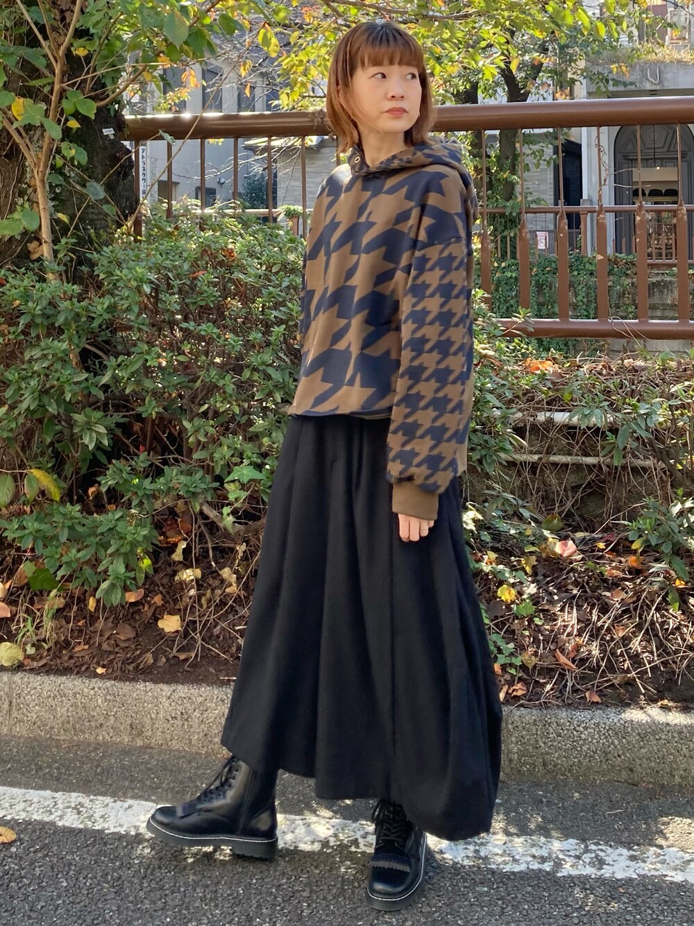 千鳥格子柄のパーカーをフラボアならではの変形パンツと合わせました。 カジュアルになりがちなパーカーですが、 キレイな感じにも見えするスタイリングです。 パーカーは着丈がいつもより少し短いので、今回の様に少しボリュームのあるボトムスとの合わせがオススメです。