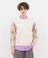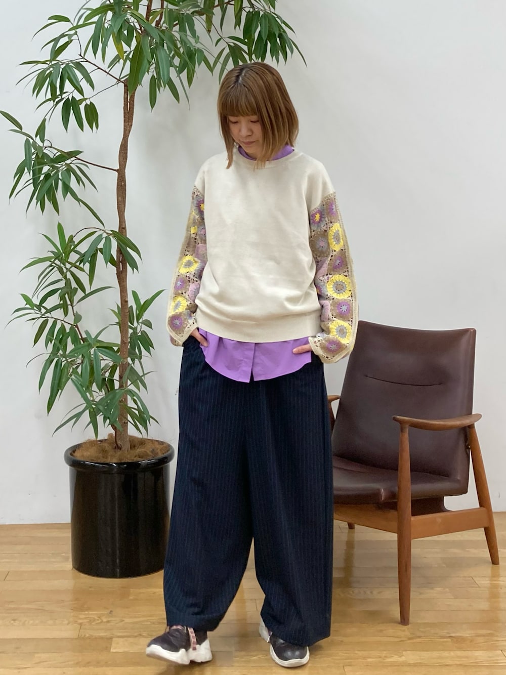 袖がお花のモチーフのかぎ針になっているので、中にシャツを着て、重ね着をお楽しみいただけます。 今発売中の【プロンシャツ】との組み合わせが色味も合い、春らしくなるのでオススメです。 今回はサルエル風ワイドシルエットのパンツで合わせ、キレイ見えするよう意識してみました。ぜひお試しください。