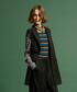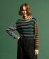 先ほどご紹介した「ジレ」を使ったコーディネート。 一枚プラスするだけで一気に大人っぽくかっこいい雰囲気が作れます。 今回はインナーにカラフルなボーダーを着てみました。 両袖、ネック、前見頃とボーダーの配色が違うニット。 ブラックコーデの差し色にオススメです。