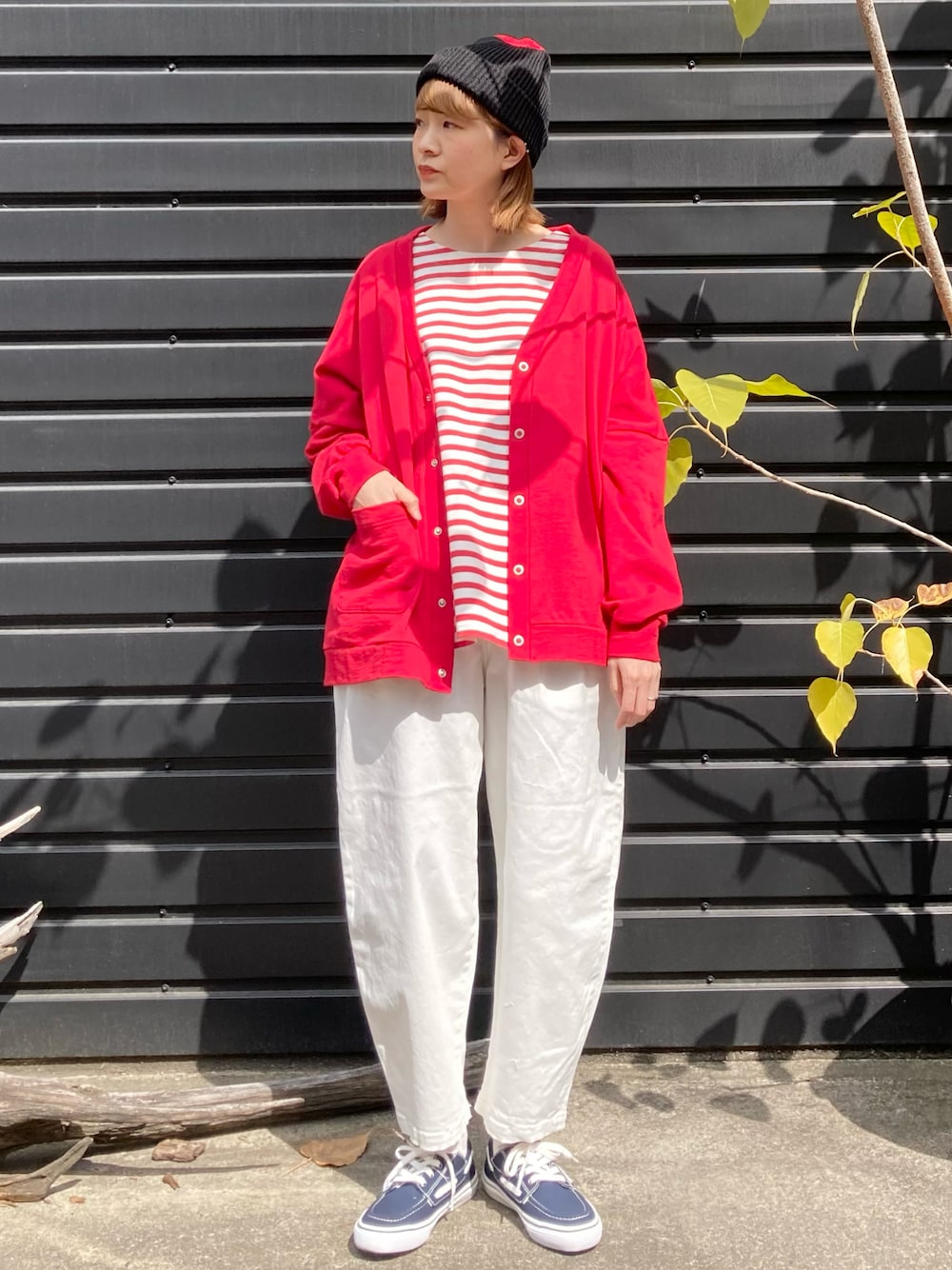 お気付きの方も多いかもしれませんが、 今年の春は、カーディガンの種類が豊富です! 厚手のニットから薄手のニット、 デザインものからシンプルなものまで。 こちらはミニ裏毛のカーディガンです。 赤は着慣れないという方は、 インナーに同じ色を使うと、まとまりが出て着やすくなります。 シンプルに白ロゴTとかも可愛いですよね。ぜひお試しください。