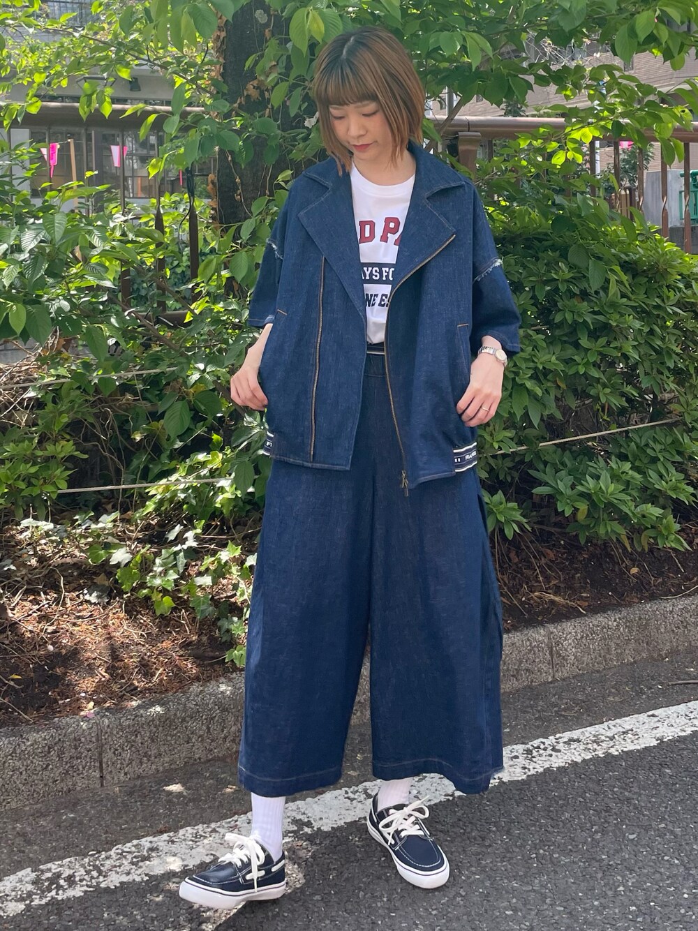 今月のデニムのセットアップです。 ライダースジャケットモチーフのブルゾンは、 今の時期だとロンTやパーカーなどを着ていただいても可愛いです。 Tシャツをインすると、ロゴゴムが前からも後ろからも見えて良いアクセントになります。 ぜひセットアップでお試しください。