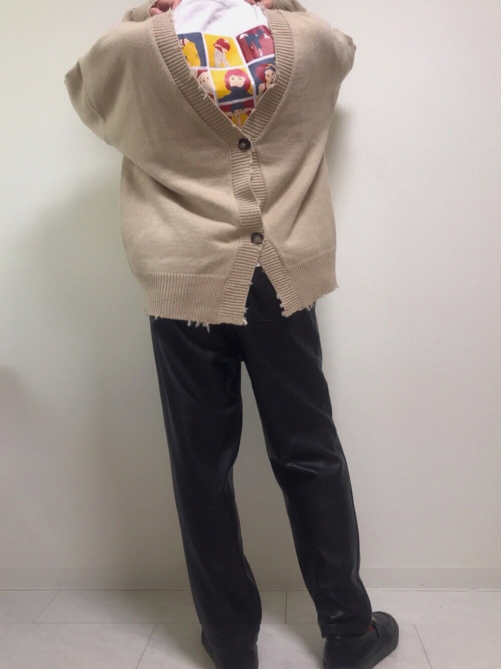閲覧ありがとうございます😊 【カーディガン×レザーパンツ】 前後どっちが前でも着れる、2wayカーディガン! ダメージ感、オーバーサイズ感完璧! あとは、お気に入りのデザインtシャツ✨ レザーパンツで引き締めた印象にすれば完成です😆 ✨ココナラ稼働中です🤖プロフィールから覗けるので、ぜひ見てってください✨