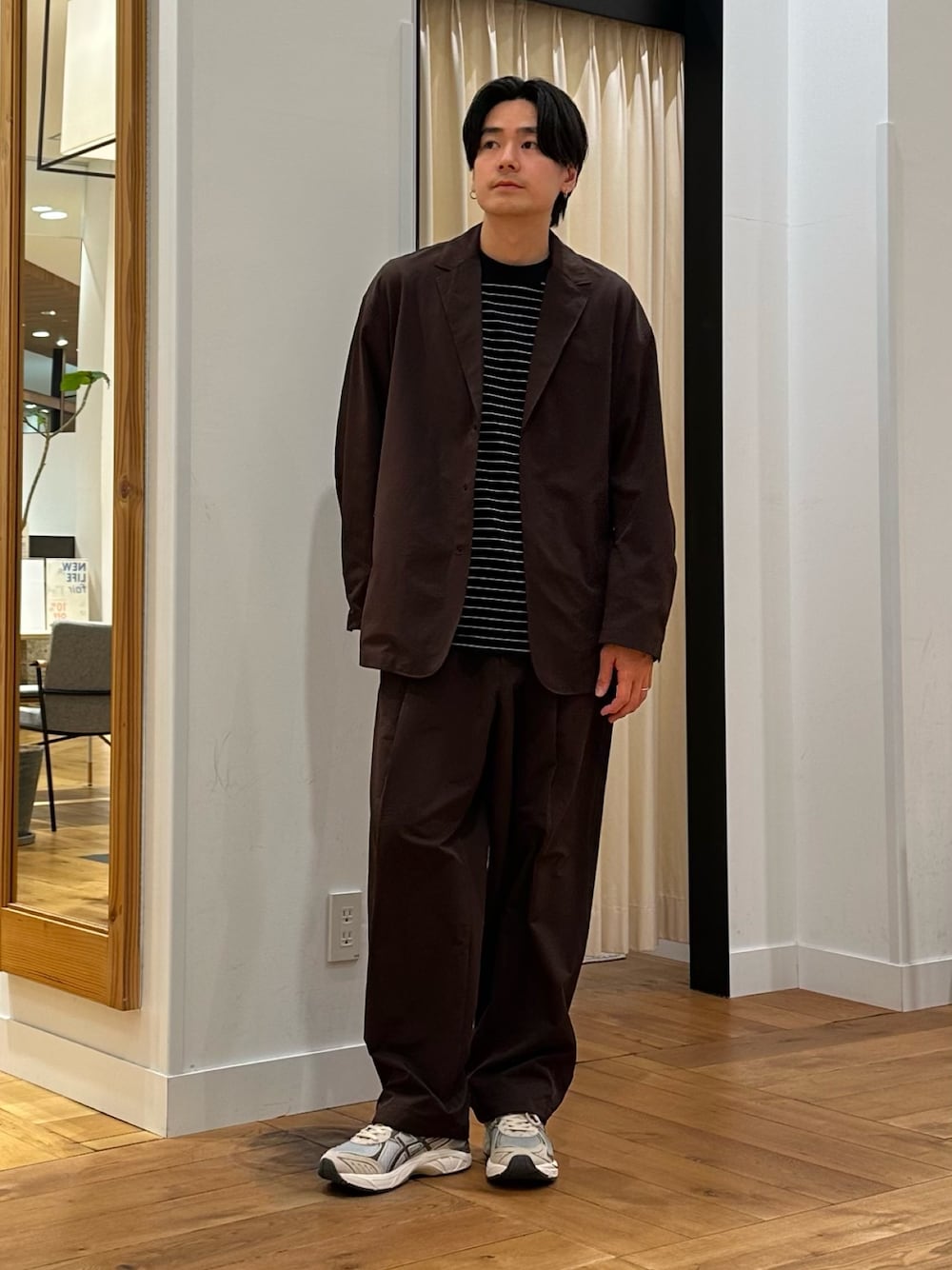 EKALのDotAirシリーズの セットアップアイテムでコーデ組んでみました!! テーラードジャケット型ですが スナップボタンや脇のシームポケットなど 程よくカジュアルダウンされていて タウンユースにオススメな1着です☺️