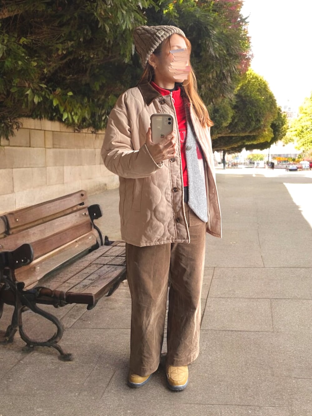 ブラウンベースに赤を差し色でホッコリ冬コーデ。