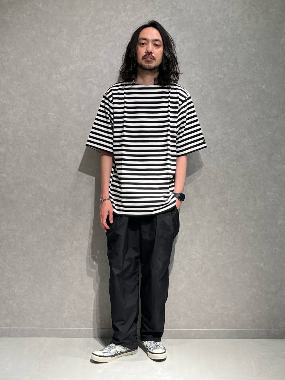 アニエスベー別注モデル。 夏はやっぱりボーダーですね。 足元はコンバース別注のパイソン柄。 良い!!
