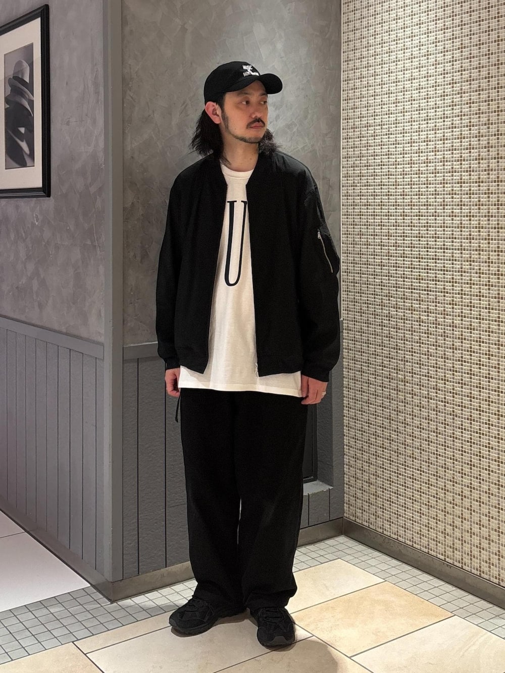 夏場まで羽織れる「冷感」素材を使用したMA1 ミニマルでモードなデザインが品の良さを醸す1着 Tシャツ isness music 品番GKM-45050 キャップ isness music 品番GKU-25110 その他 スタッフ私物