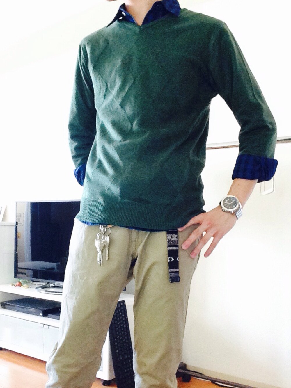 緑のセーターに青のチェック! 秋っぽい感じでキレイ目に!