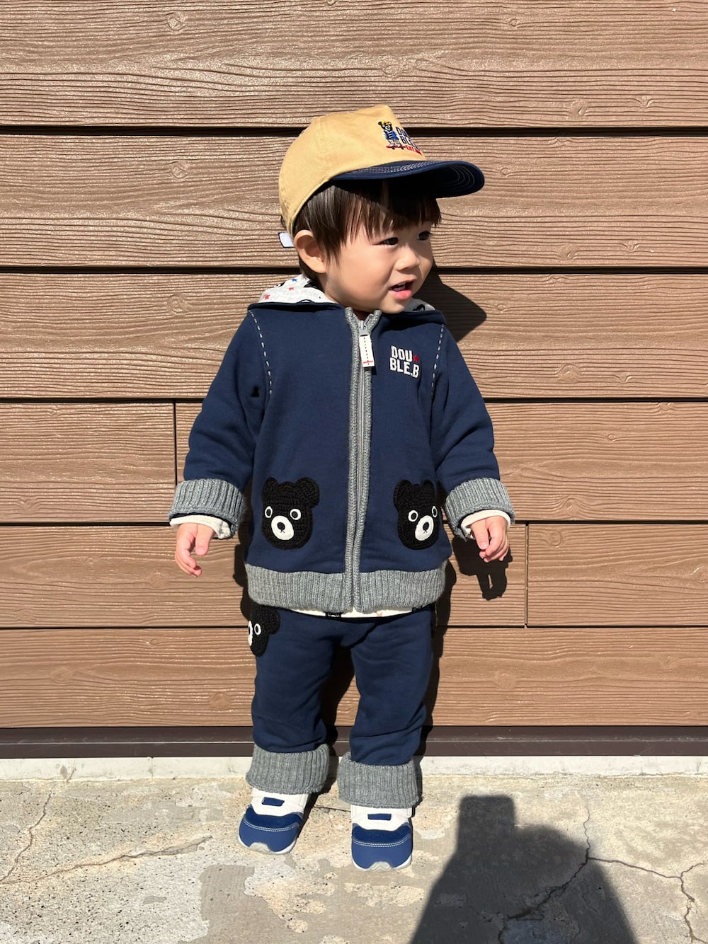 ご覧いただきありがとうございます😊 いいねフォローsave嬉しいです🥹🙏 1y8m 約80cmの男の子です✨ MIKI HOUSEのダブルビーで全身揃えてみました🥰 スエットセットアップは動きやすくて、公園では大はしゃぎでした😂 90cm着用なので、上下とも一回折りです〜!
