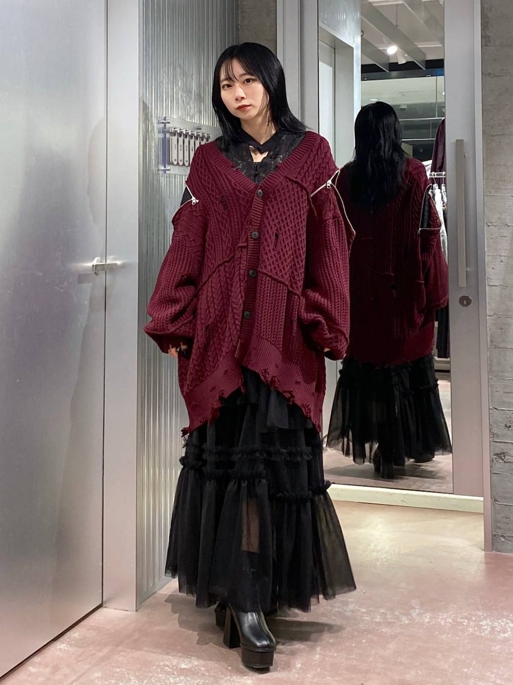 カーディガンはユニセックスアイテムです! □スカート ボリューミィなデザインを使いやすいバランスに落とし込んで日常使いしやすいアイテム! 軽さのあるチュールを数枚重ねて程よい透け感に! 後ろゴムですぽっと履けるので、ストレスフリーで楽ちん!