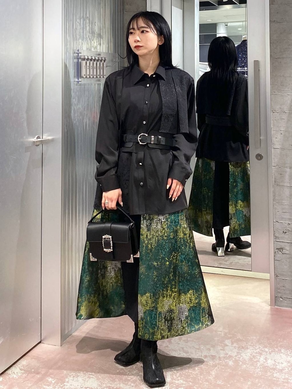 □スカート ラメ感のあるジャガード生地を使用したHAREらしい切り替えデザインスカート! 柄と無地の切り替えなので、柄が苦手な方でも取り入れやすいデザイン◎