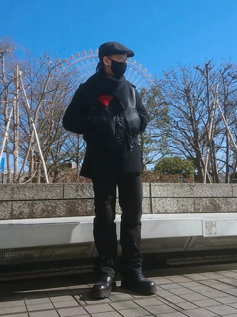 真冬の寒さだけど風がなくて日差しあると暖かい。 オールブラックでカジュアルよりに。 SOSHIOTSUKIのデニムとサリバンのニットにatoのMA-1ベストでレイヤード。 ハンチングとブーツでおとなしく。