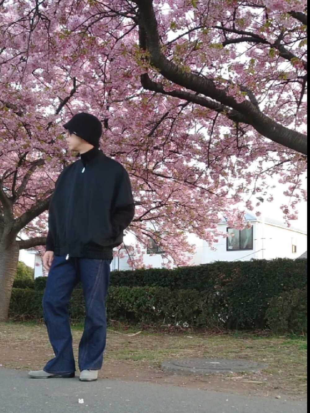河津桜きれい。 今日は暖かいね。 ドライバーズニットにsiseのスリーブレスバルーンブルゾンをレイヤード。 フレアデニムで合わせる。