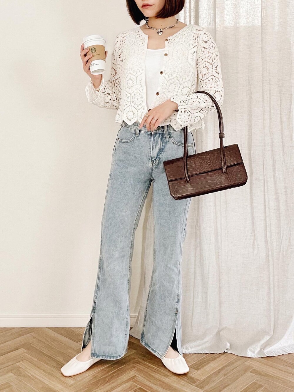 ひぃちゃんのデニムパンツ「【apretro】スリットデニムパンツ〈セミフレア/ベルボトム〉」を使ったコーディネート