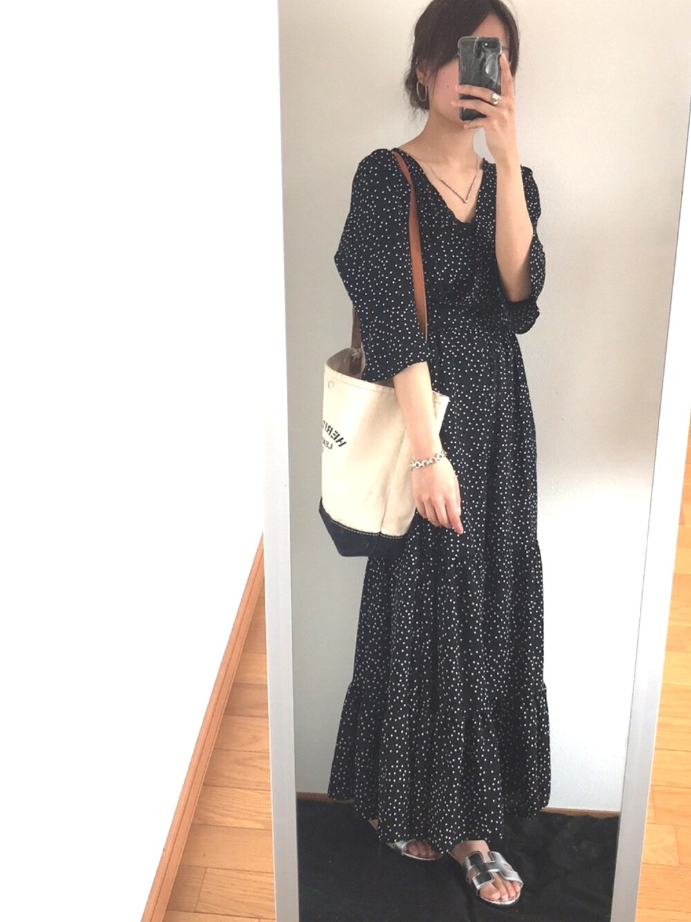 黒のワンピースは重たいので、 お団子で頭回りを軽くして シルバーのサンダルで涼しさをプラスしてみました! #ヘリテージレザー のこのバッグ何十回使ったのだろう..