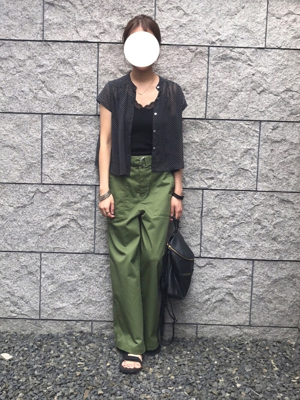 いつもはボタンを閉じて着るブラウスだけど、 今日はオープンにして羽織りもの風に(^O^) このブラウスは薄地だから夜洗濯しても次の日に着られるし 丈が短いからインしなくても脚長効果が!