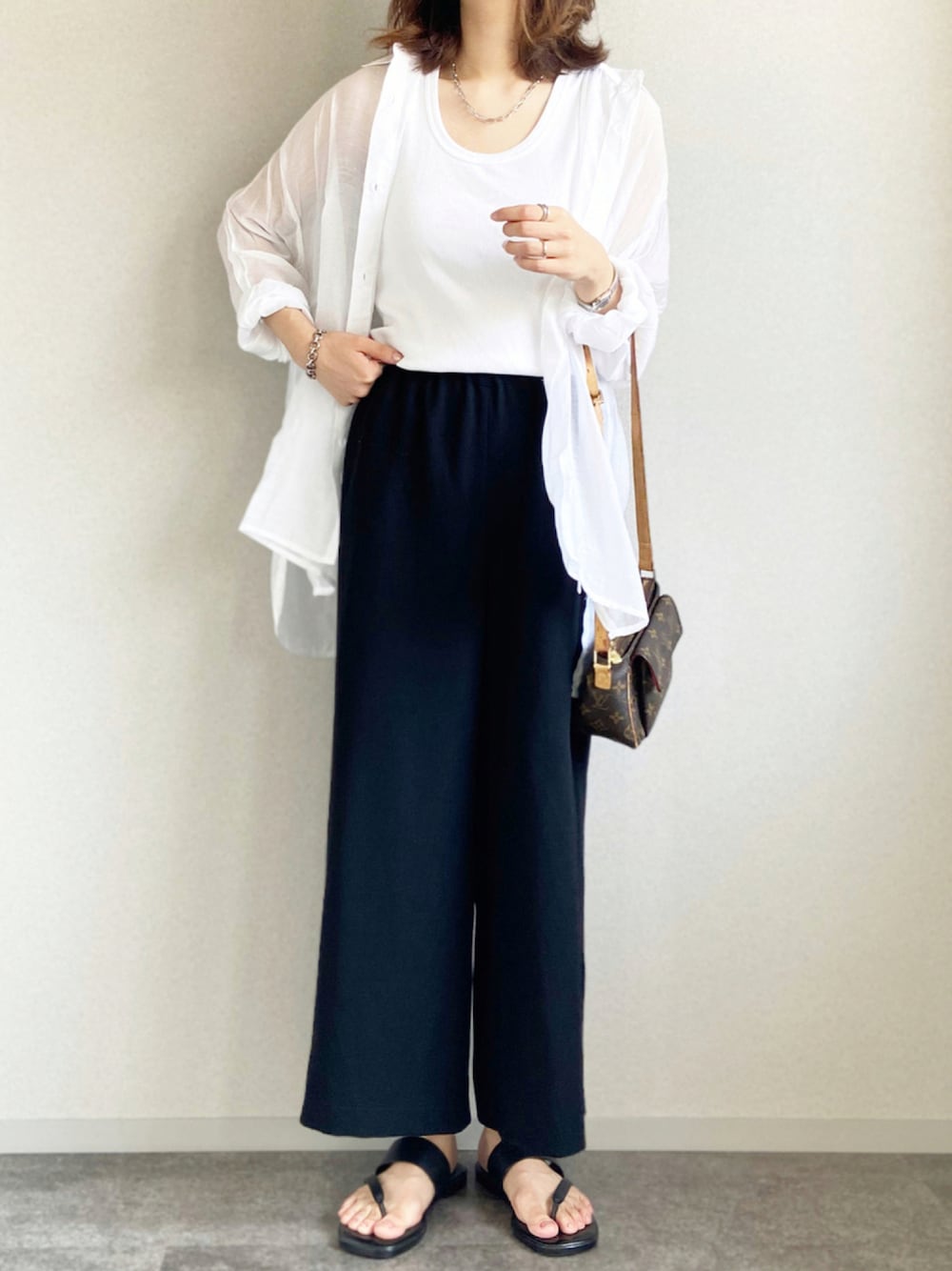m___のシャツ/ブラウス「上品な光沢感。シアー素材ビッグシャツ(長袖)」を使ったコーディネート
