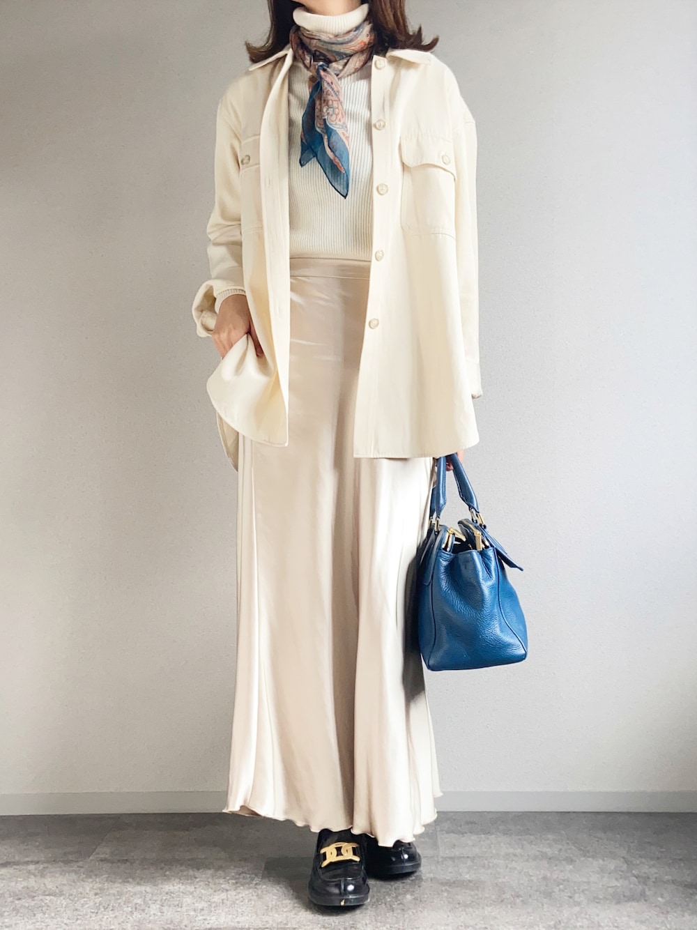 お気に入りやフォローありがとうございます😊 サテン、ニットなど異素材をワントーンでまとめ て 首元にスカーフを巻いてみました🍁