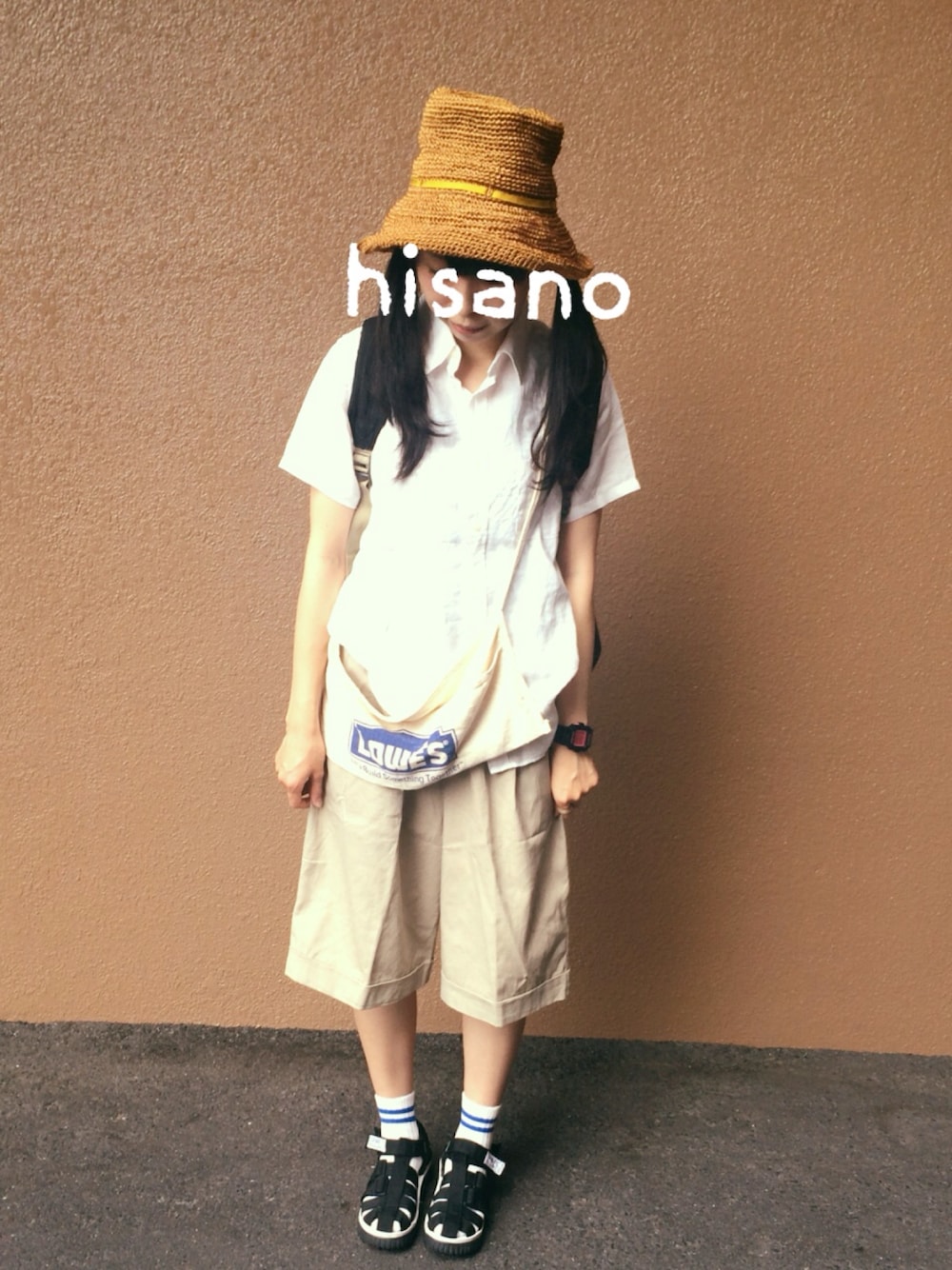 麦わら帽子 白シャツ しましまタンクトップ ハーフパンツ ラインソックス シャカ ワークエプロン 大きめリュック 今日のテーマは探検隊!