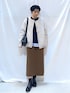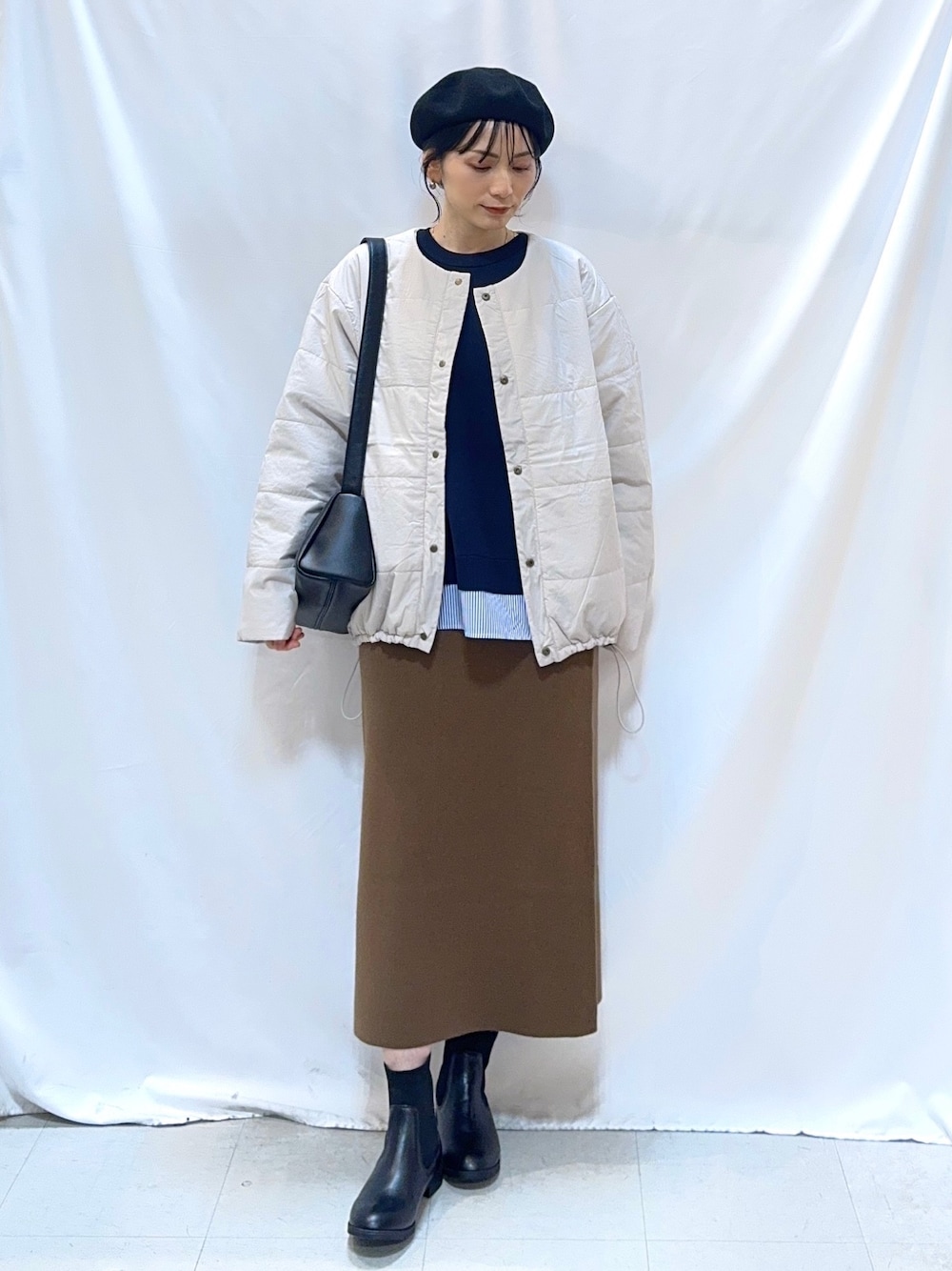 ネイビー×ブラウンのシックな配色が落ち着いた大人の印象に。アウターはミディアム丈のライトカラーを選んで、全体をほどよく軽やかにまとめました。重たく見えず、季節の変わり目にも取り入れやすい着こなしです◎ ※ブーツはスタッフ私物です。