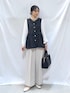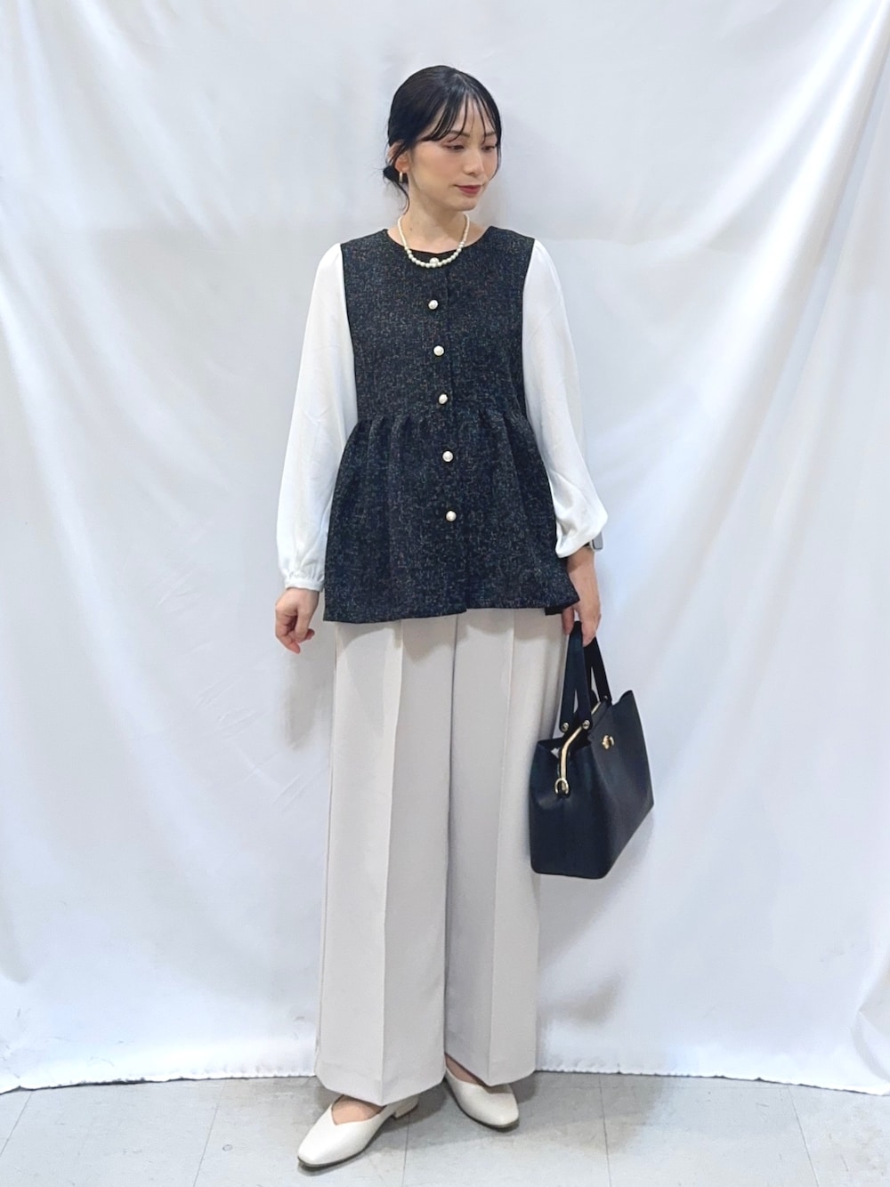 上品なレイヤード風トップスにワイドパンツを合わせたきちんとスタイル。通勤やお仕事、セレモニーなど様々なシーンで活躍します^^