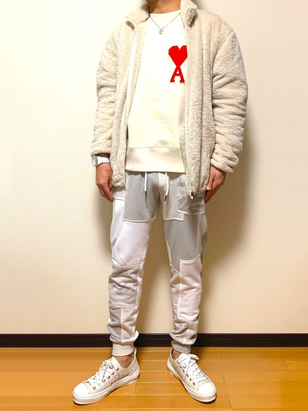 ホワイト系でスウェットラクチンスタイル😊 寒くなってもホワイト系着ちゃいます✨ 今日はワントーンで。 出かけるときにバランス取るのに薄めのグレーストール追加したけどAmiハート見えなくなるから撮る時は外したw っつか部屋着以外のフリースって初めて買った😆 UNIQLOフリースフカフカモフモフ気持ち良すぎ❤️ コスパ良すぎ❤️ スウェットトレーナー → ami alexandre mattiussi AMI DE COEUR パッチ オーバーサイズ スウェットシャツ 19AW フリースジャケット →UNIQLO ファーリーフリースフルジップジャケット スウェットパンツ →1piu1uguale3 Relax カモパッチワークジョガーパンツ スニーカー →Dior Oblique B23 ローカットスニーカー