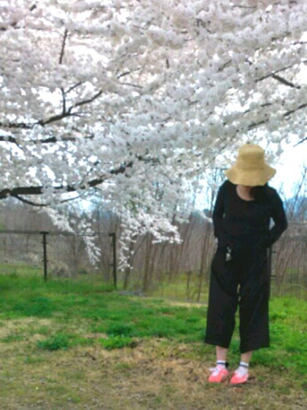 お花見行ってきましたー!オールブラックにカラフルスニーカーコーデ。麦わら帽子は春、夏、秋は毎日かぶります。
