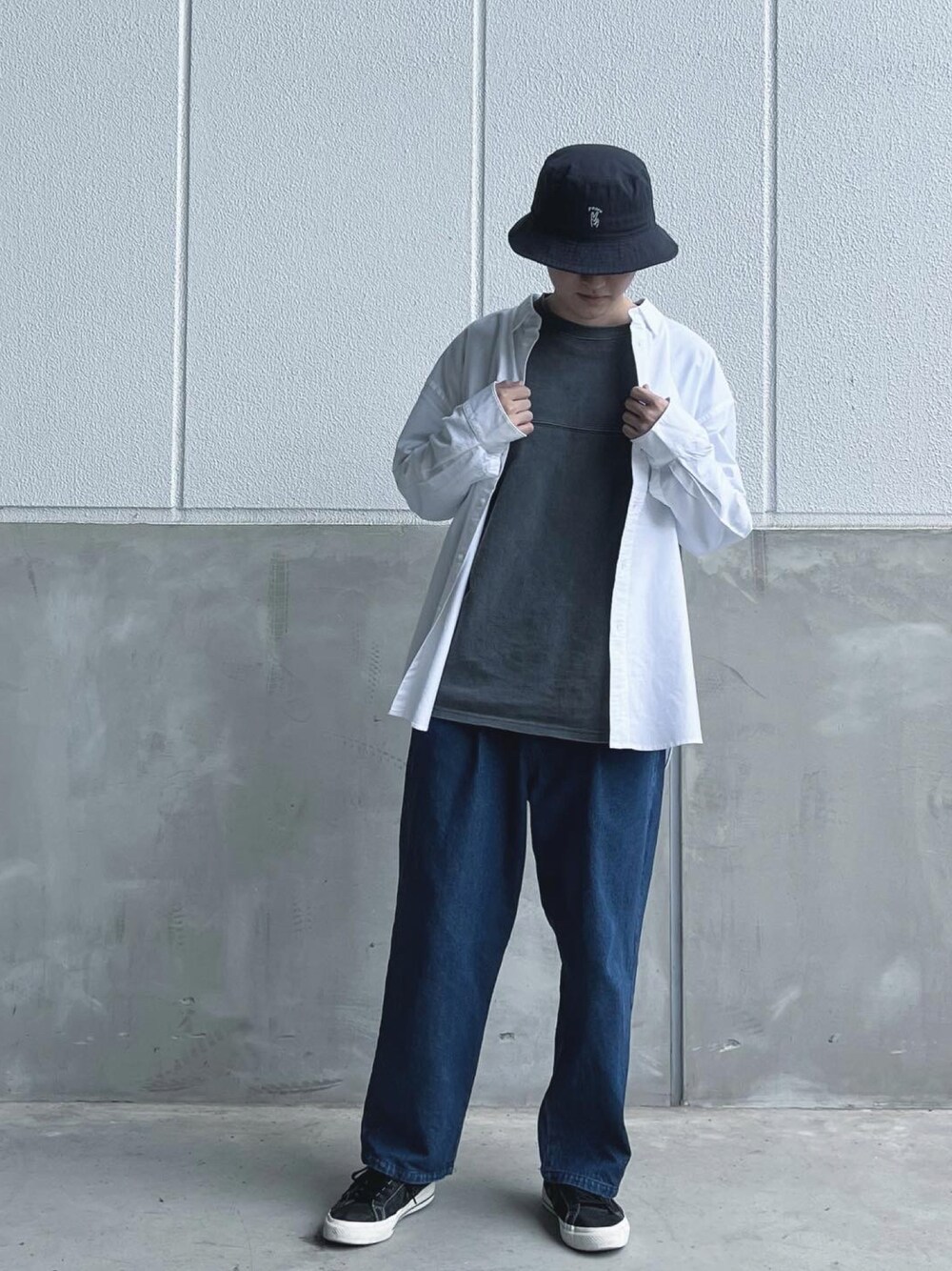 メランコーデです 当店自慢、メランおじさんのオックスフォードシャツ 厚めの生地感で着心地抜群です デニムパンツもワイドシルエットで存在感バツグン