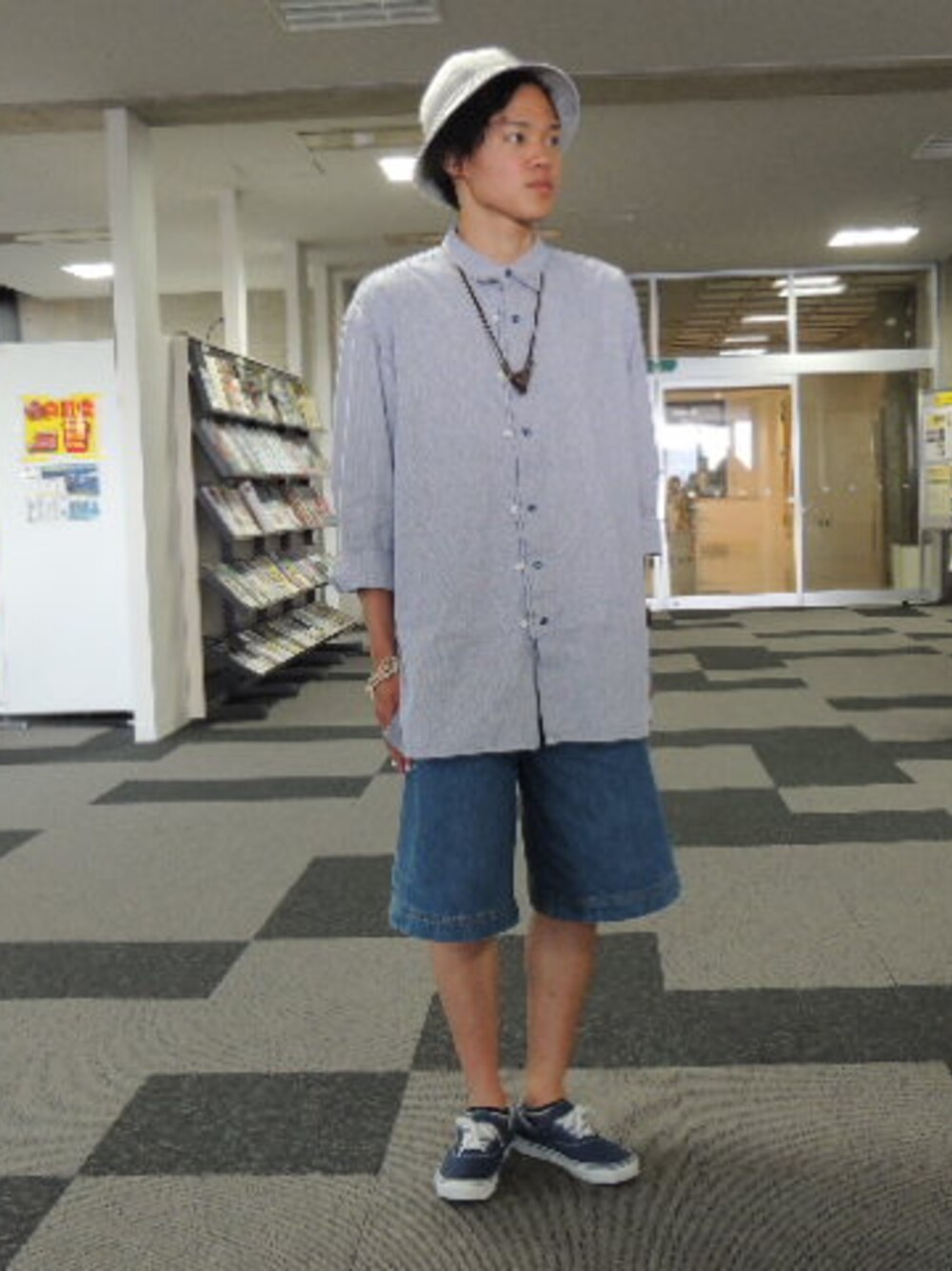 グレー系のシャツ/ブラウス、ブルー系のデニムパンツ、ブルー系のスニーカーを着用したメンズの夏コーディネートの1枚目の写真