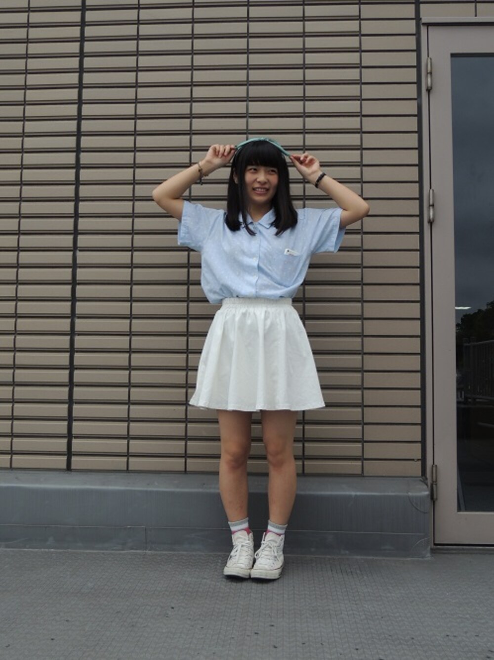 ブルー系のシャツ/ブラウス、ホワイト系のスカート、ホワイト系のスニーカーを着用したレディースの夏コーディネートの1枚目の写真