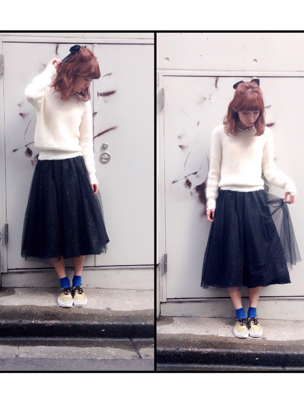 白のモヘアニットに GUNNESAXのチュールスカート。 足元はバンズのキラキラスニーカーと 青のソックスではずしました!