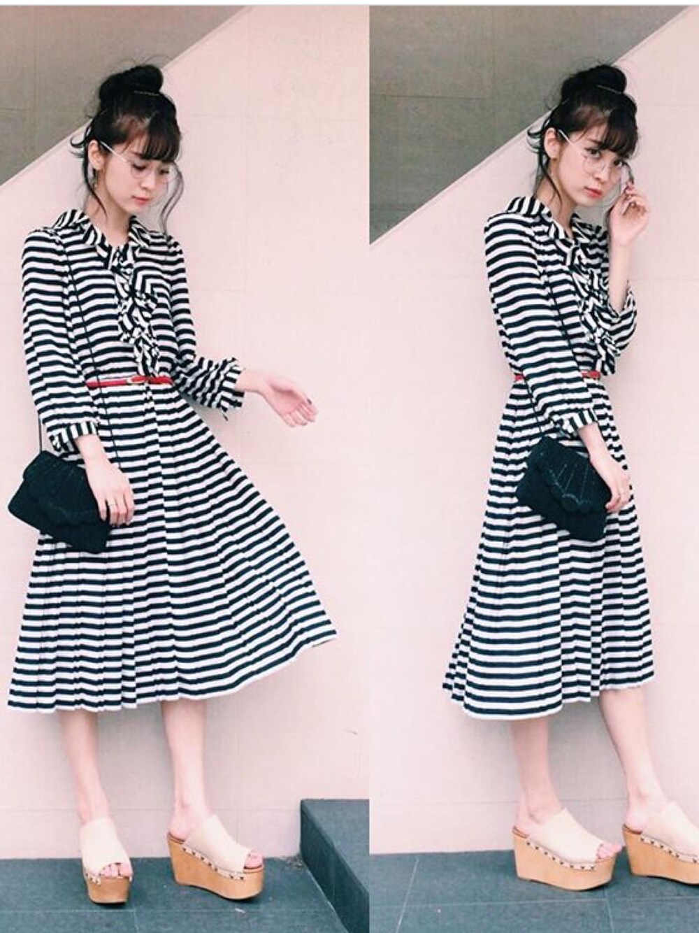 ブラック系のワンピースを着用したレディースの春コーディネートの1枚目の写真