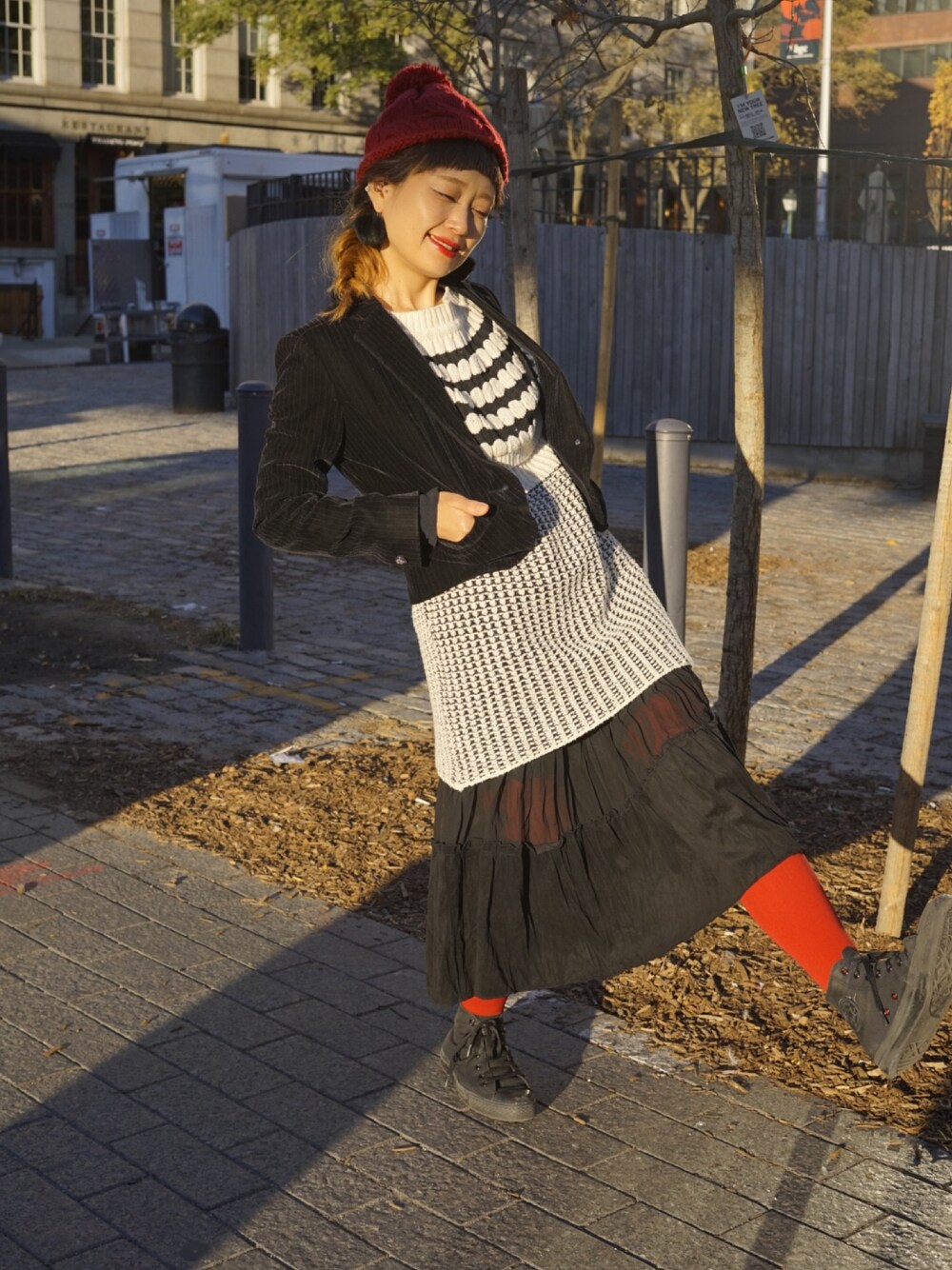 モノトーンに差し色でニット帽の赤とタイツの赤 口紅も珍しく真っ赤っか。