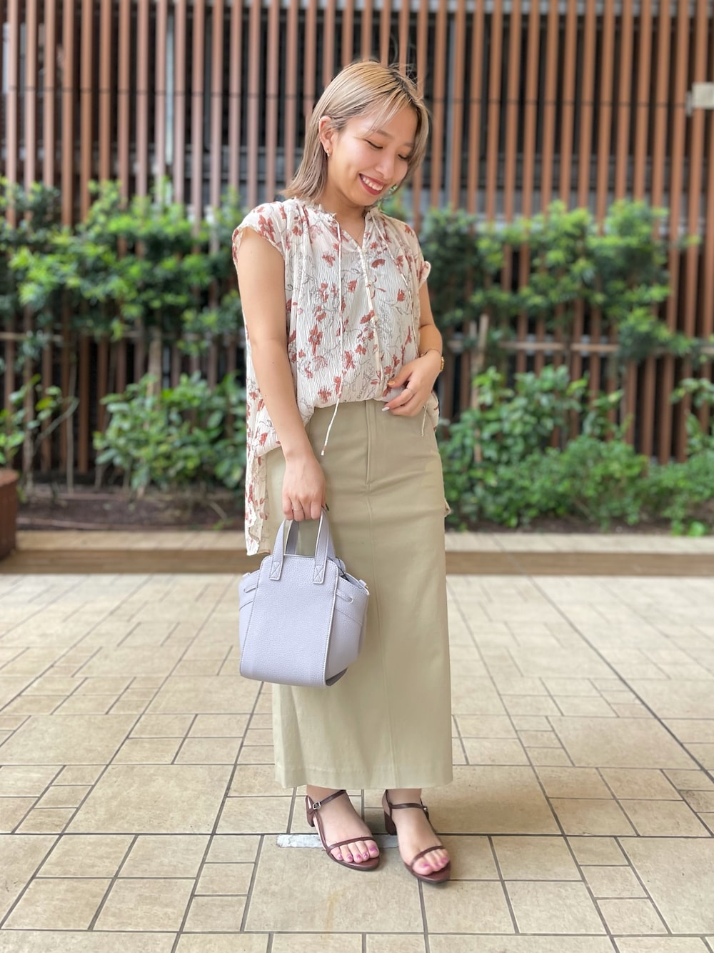 ベージュのワントーンコーデ✨ フラワープリントが目を惹くブラウスです◎