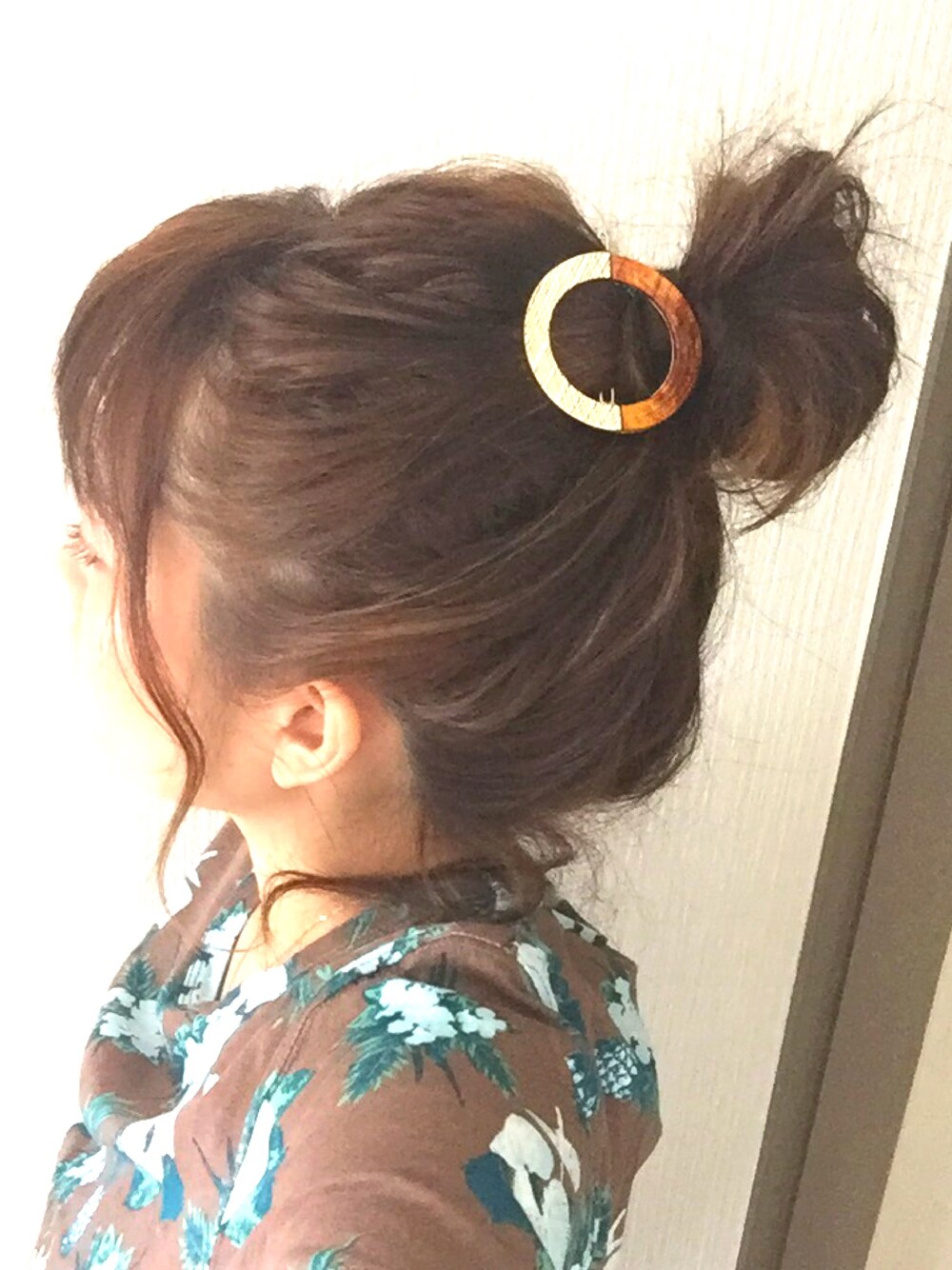 今日のヘアアレンジ☆ 無造作にまとめたお団子、後れ毛はコテで巻いてます( ´ ▽ ` )ノ 暑い日はアップスタイルがいいですね(^_^)