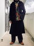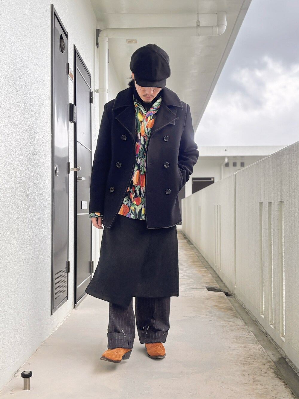 冬は全体的に黒くなりがちなのでチューリップ柄の シャツで明るく パンツにスカートを重ねることでシルエットに遊び心を 冬のレイヤードコーデ