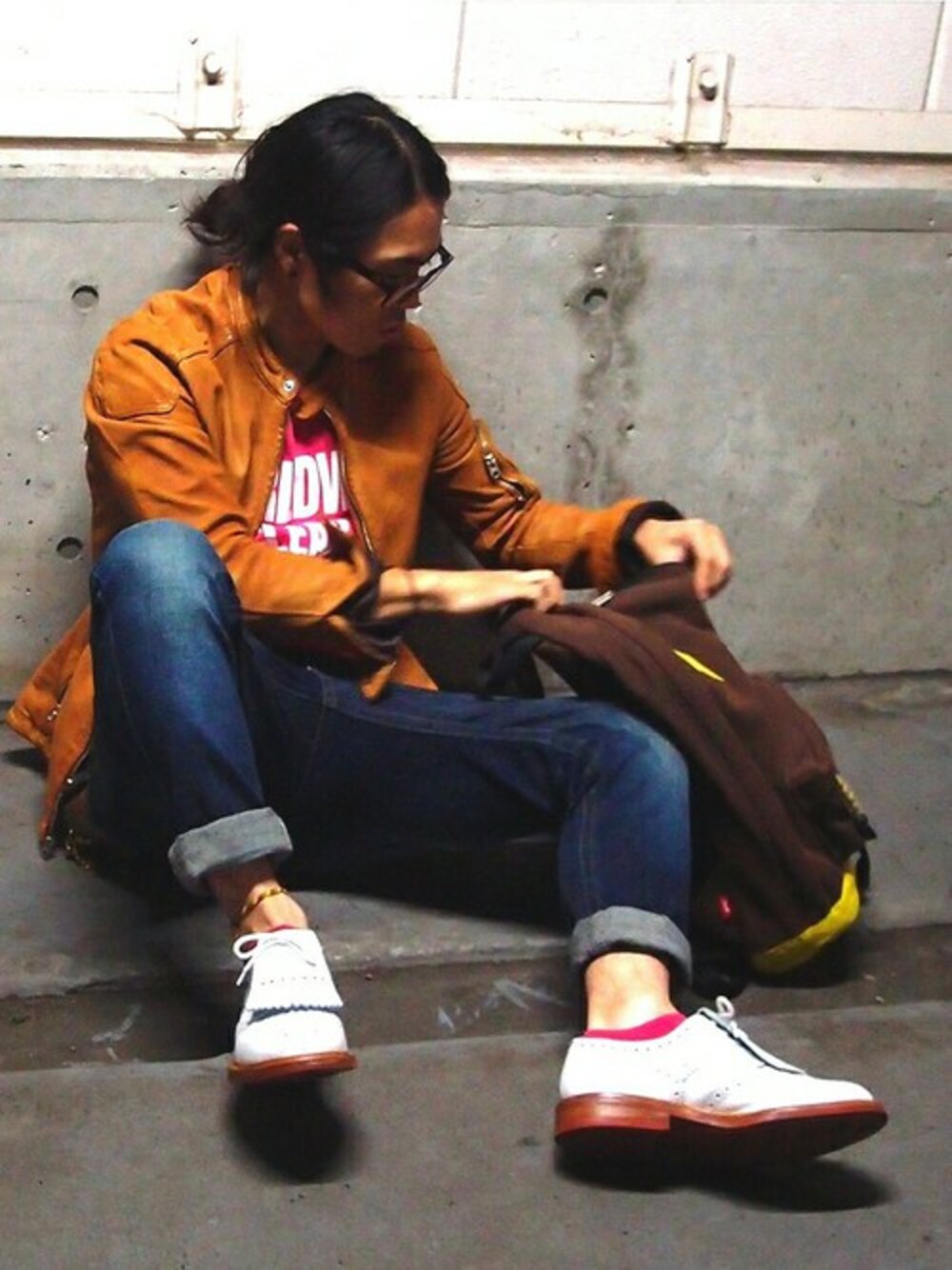 タケダヒロタカ★★★のライダースジャケット「GOAT OVERDYE SINGLE RIDERS / レザー MA-1 ブルゾン」を使ったコーディネート