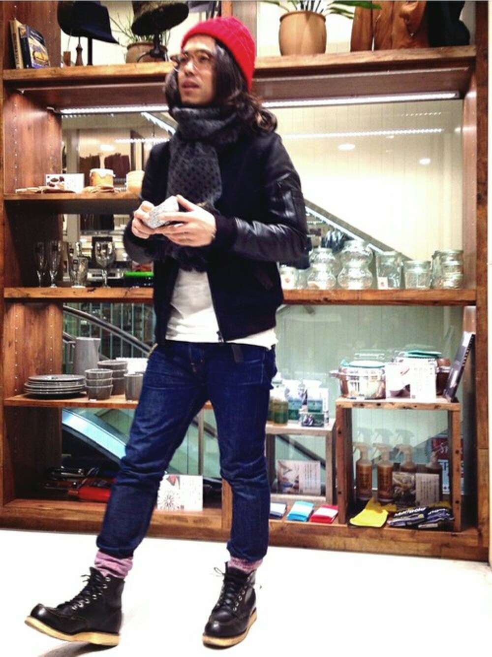 マフラーで少しボリュームを足してタイト過ぎないシルエットを作っています。