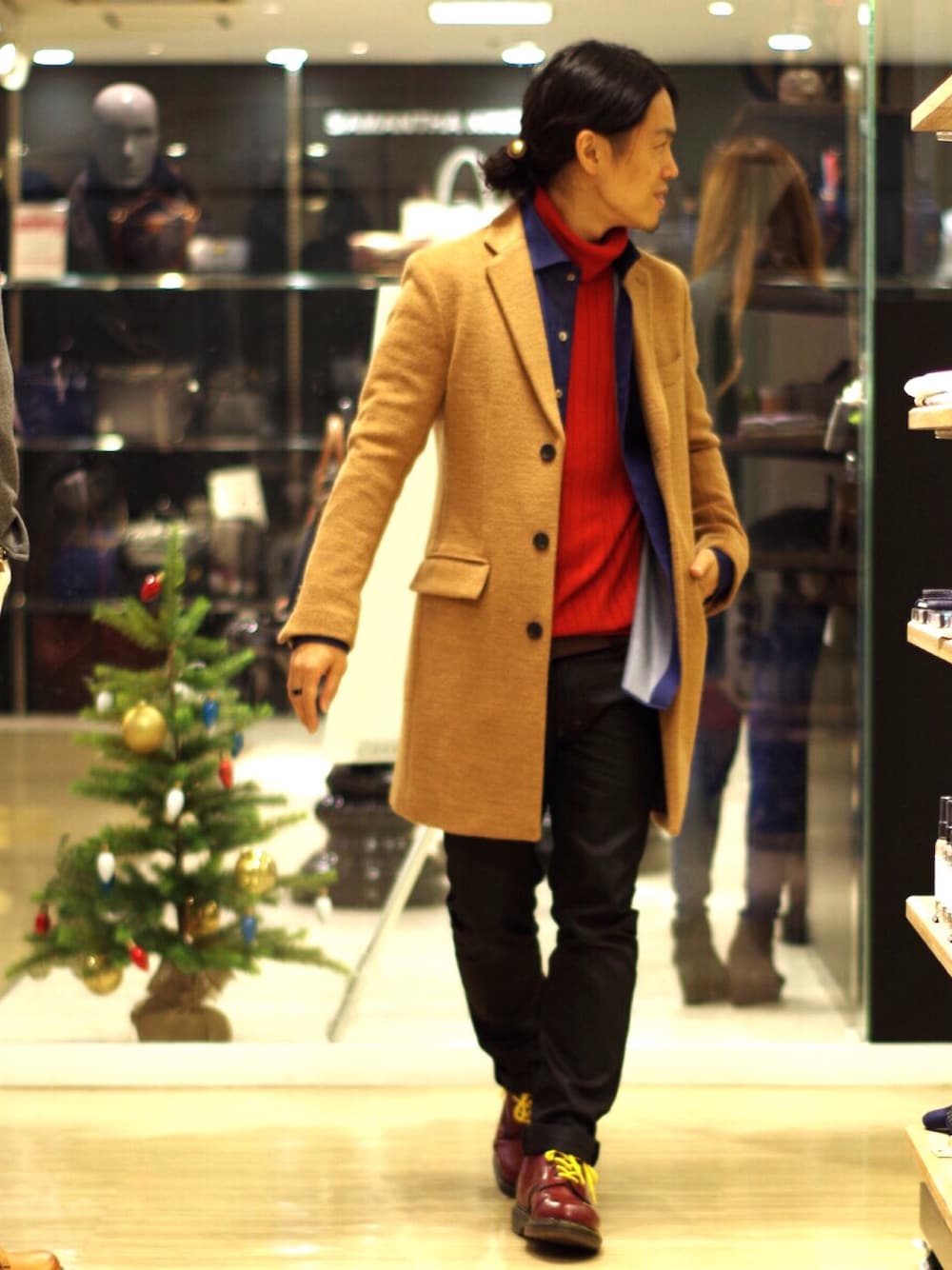 ベージュのコートの可能性に身を任せ、好きなように着ちゃってます♪
