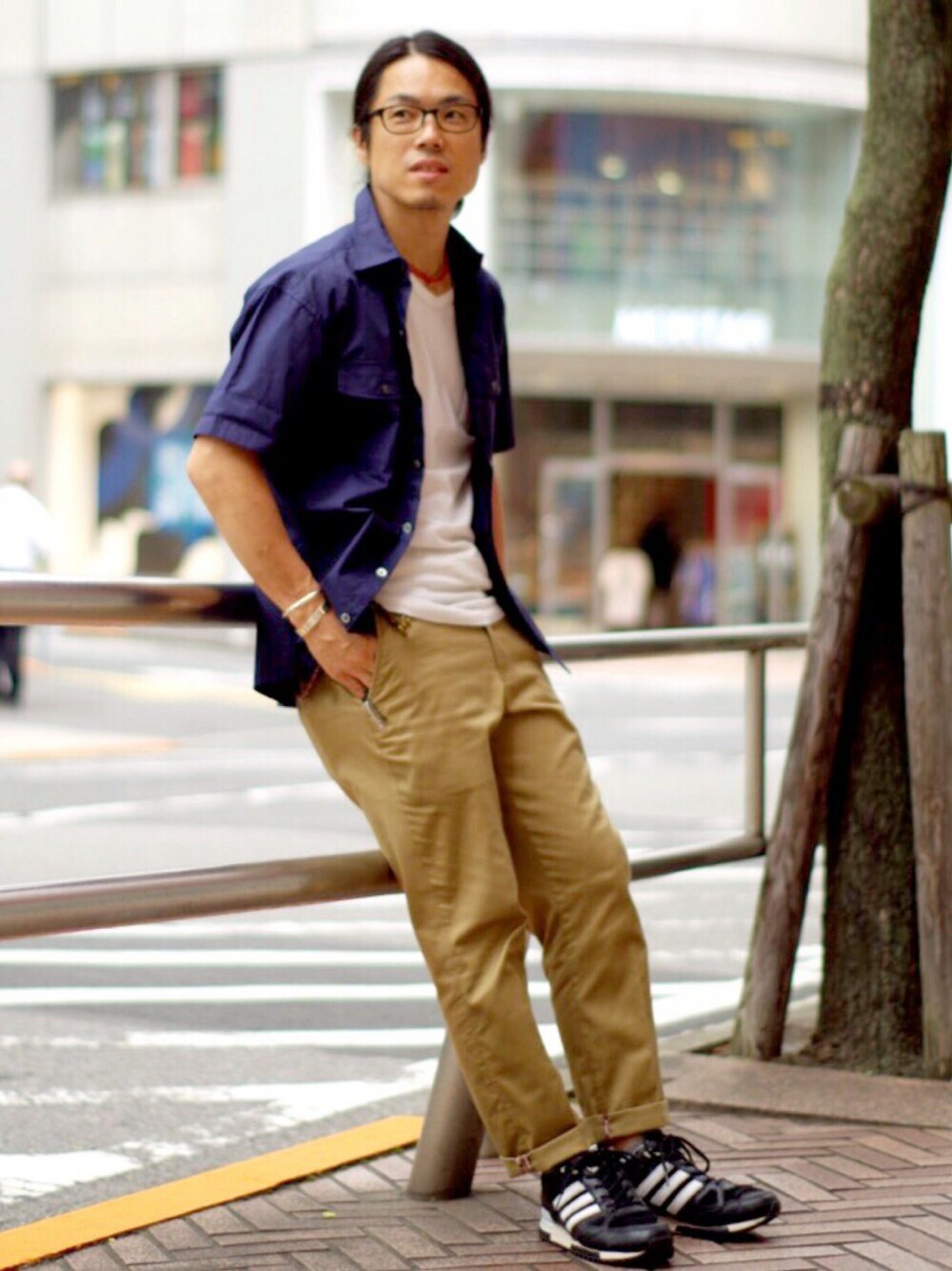 両胸にポケットのあるシャツは アウター感があるので羽織りやすいです。 やぼったくならない様 細身のチノでスッキリとさせてみました。