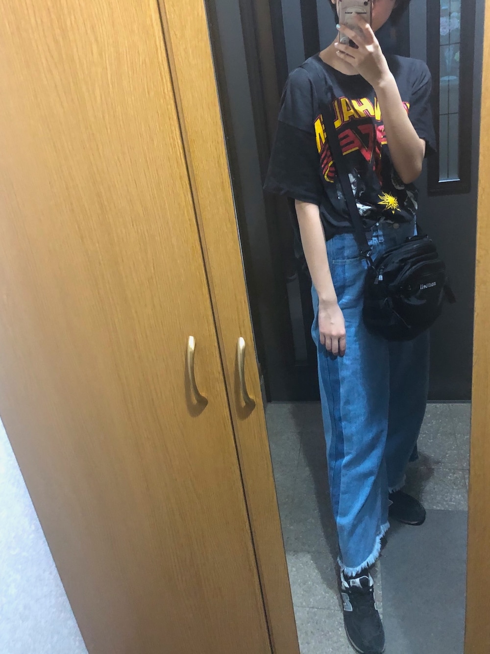 今日は古着のバンドTをメインにコーデしてみました。 パンツはライン入りのワイドデニムで足長効果があるのにゆるっと着れるのでらくでとってもお気に入りです。