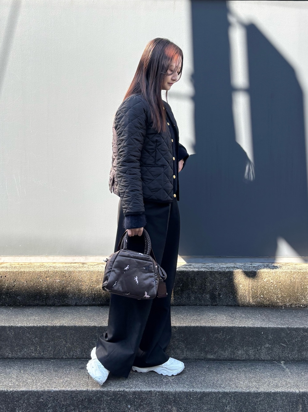 光沢のあるクラウズナイロンの素材が カジュアルになりすぎないので ジャケットなどの綺麗めスタイルとも合います◎