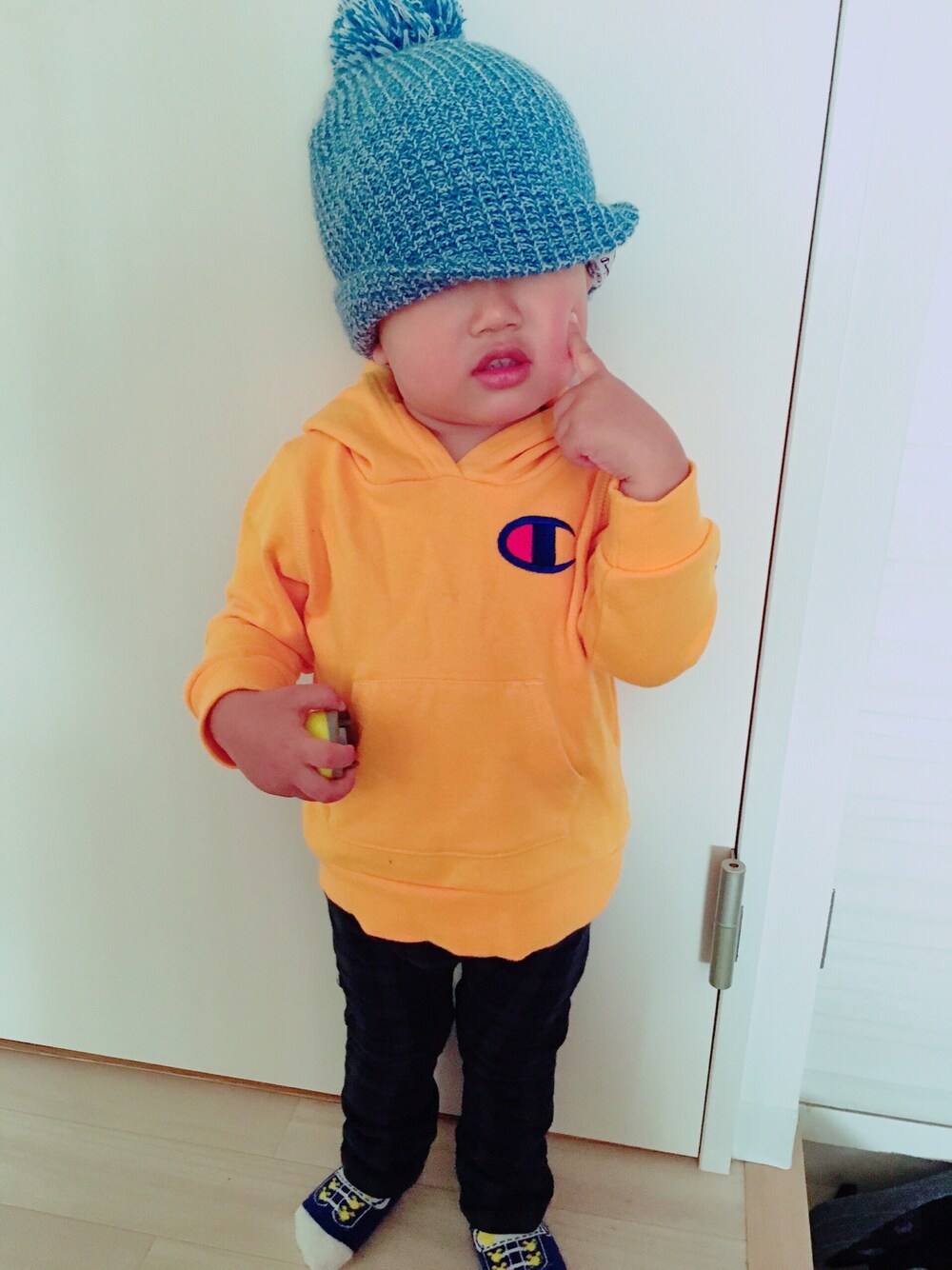 ニット帽の折り返しをのばしたいお年頃。