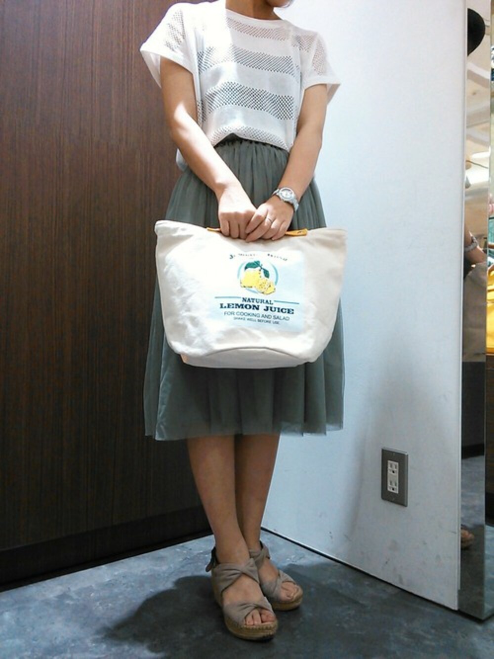 「アップル」 「パイン」 「レモン」 のラベル三色展開。 オフホワイトのサマーニットにひざ下丈のカーキ色のチュールスカートでガーリーなコーデのはずしアイテムに取り入れてみました。