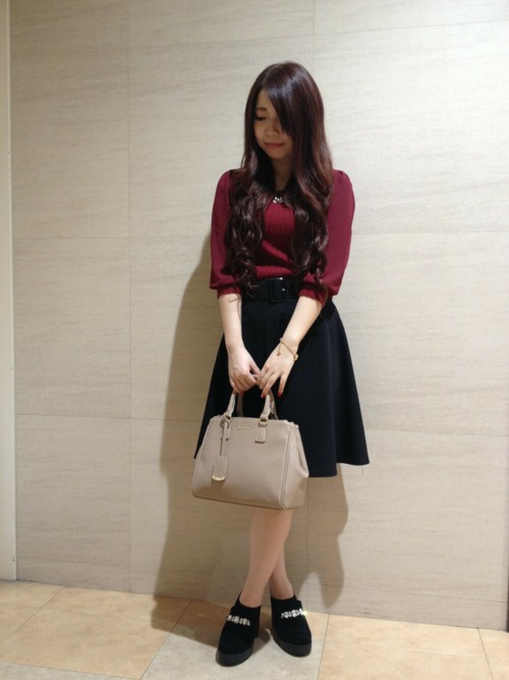 みなさん、こんばんは~。 本日は博多阪急店からです。 本日より10月1日。一昔は衣替えの日としてクローゼットをゴソゴソしていましたが 暑かったり寒かったりでなかなか出来ない日々が続いています。 本日紹介するバッグはミニダブルファスナー2WAYトートバッグです。 この秋大人気のカラーであるバーガンディのトップスに黒のフレアスカートに合わせてみました!! シンプルかつ上品なスタイルにはこの2WAYミニバッグを合わせて女性らしさをプラスしてみませんか? ONにもOFFにも合わせやすいバッグなので、色んなシーンで活躍すること間違いナシ\(^o^)/