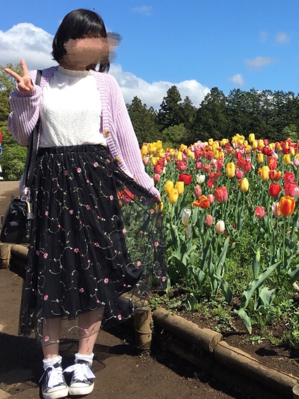 お袖たぷなカーデは パープルをちょいす❤ プチハイネックレースに 刺繍スカート合わせたよ◎ ソックスもレースにして スニーカーの紐りぼんに! バッグはかわいいレースアップ。