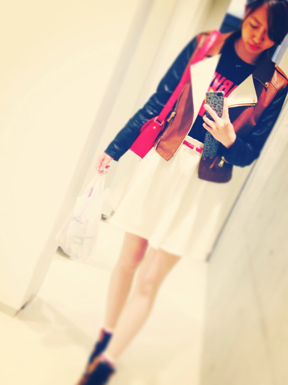 ジャケット F21 Tシャツ GU スカート WEGO ベルト GU ポシェット WEGO プチプラコーデ。 赤いポシェットに赤リップ♡ スクールコーデ。