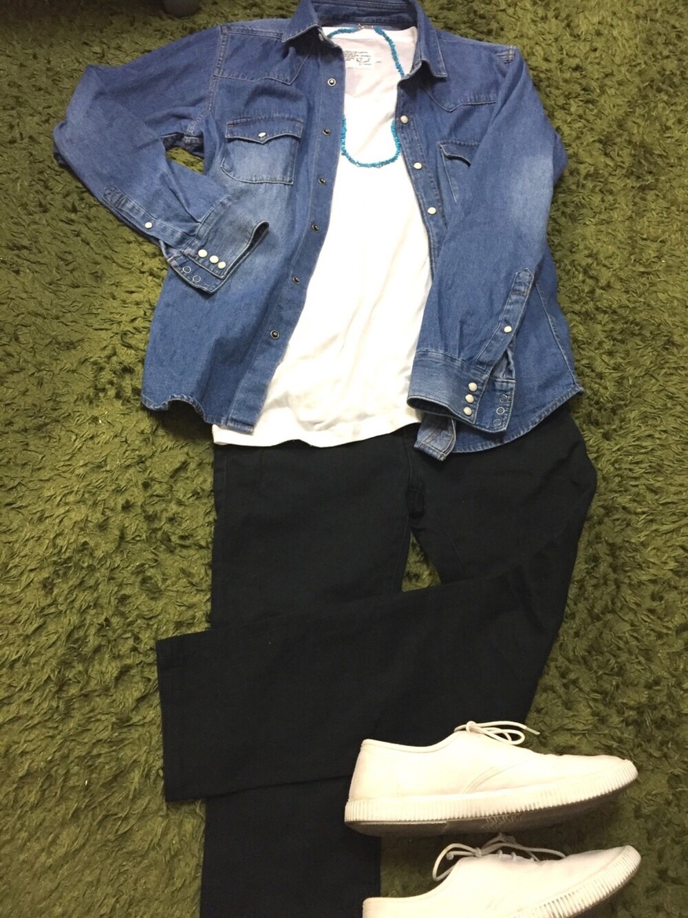 春コーデ🌸 爽やかにしました〜 ネックレスはターコイズビーズを繋げて自分で作りました。 かかった費用は400円くらい笑 手作りは安くていいね👍