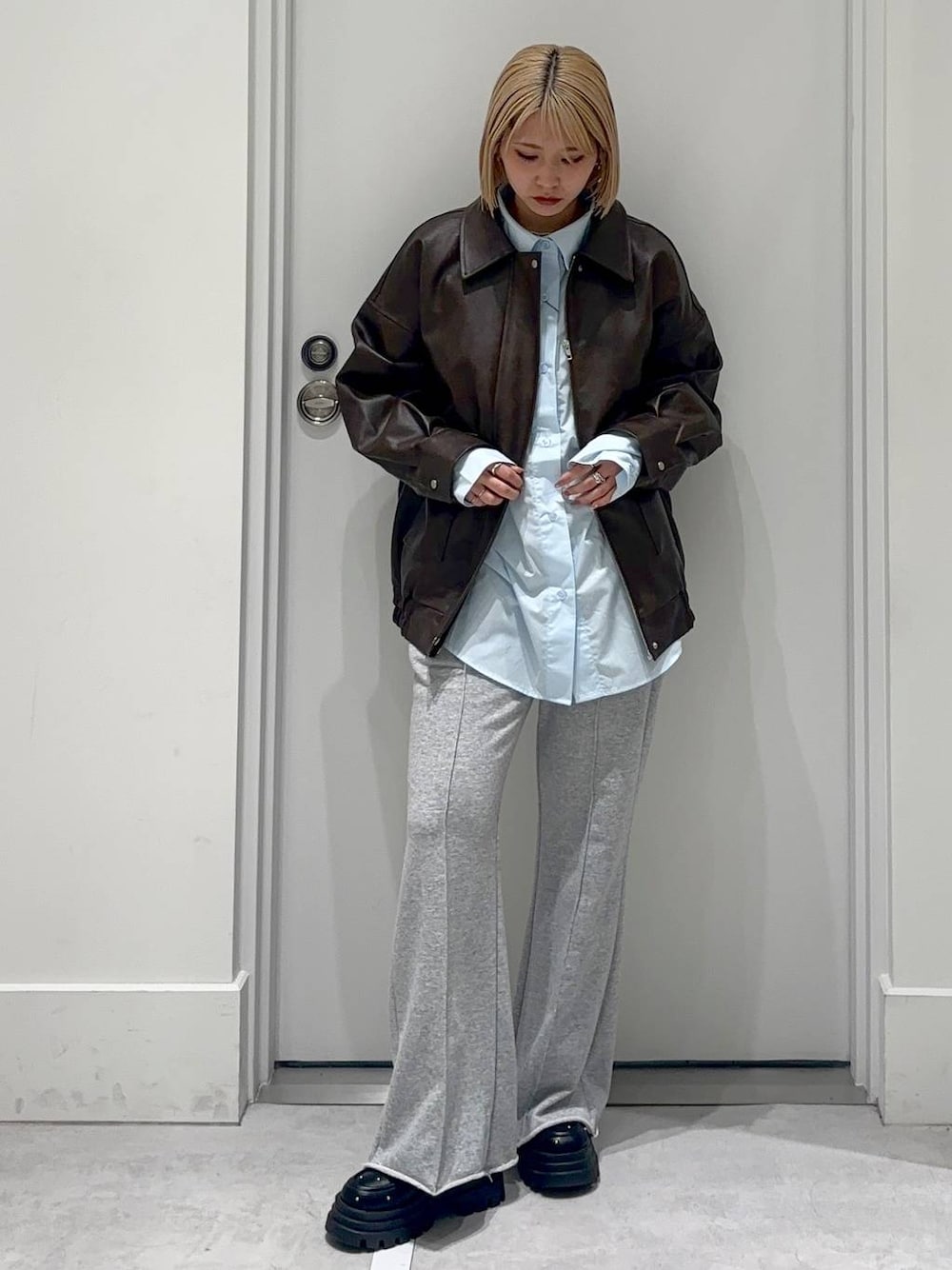 トップス👕 シャツはシンプルで使いやすくインナーにも羽織にもできちゃう万能アイテムです!丈感は長めなので腰回りもカバーしてくれます✨ アウター🧥 ヴィンテージ感のあるカラーが可愛いレザージャケット 春には一枚持っておくとめちゃくちゃ使える万能アイテムです!大きめのサイズ感なので中にも着こめちゃいます♪ ボトムス👖 センターラインが入って、フレアシルエットになってるのでスタイルアップしてくれるスウェットパンツ✨✨ カジュアルになりすぎず私服使いしやすい楽ちんパンツです!