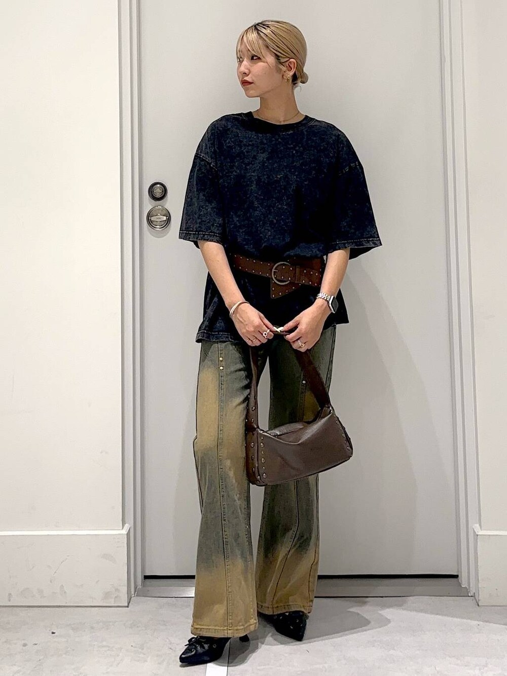 トップス👕 ヴィンテージカラーとビッグシルエットが可愛い オーバーT☆ ベルトでウエストマークしてスタイルアップ効果‼️ ボトムス👖 トレンドのヴィンテージカラーとスタッズを取り入れたデザインデニム🎶 一枚でスタイリングのポイントになってオシャレ見え✨ フレアシルエットなのでスタイルアップして着られます!